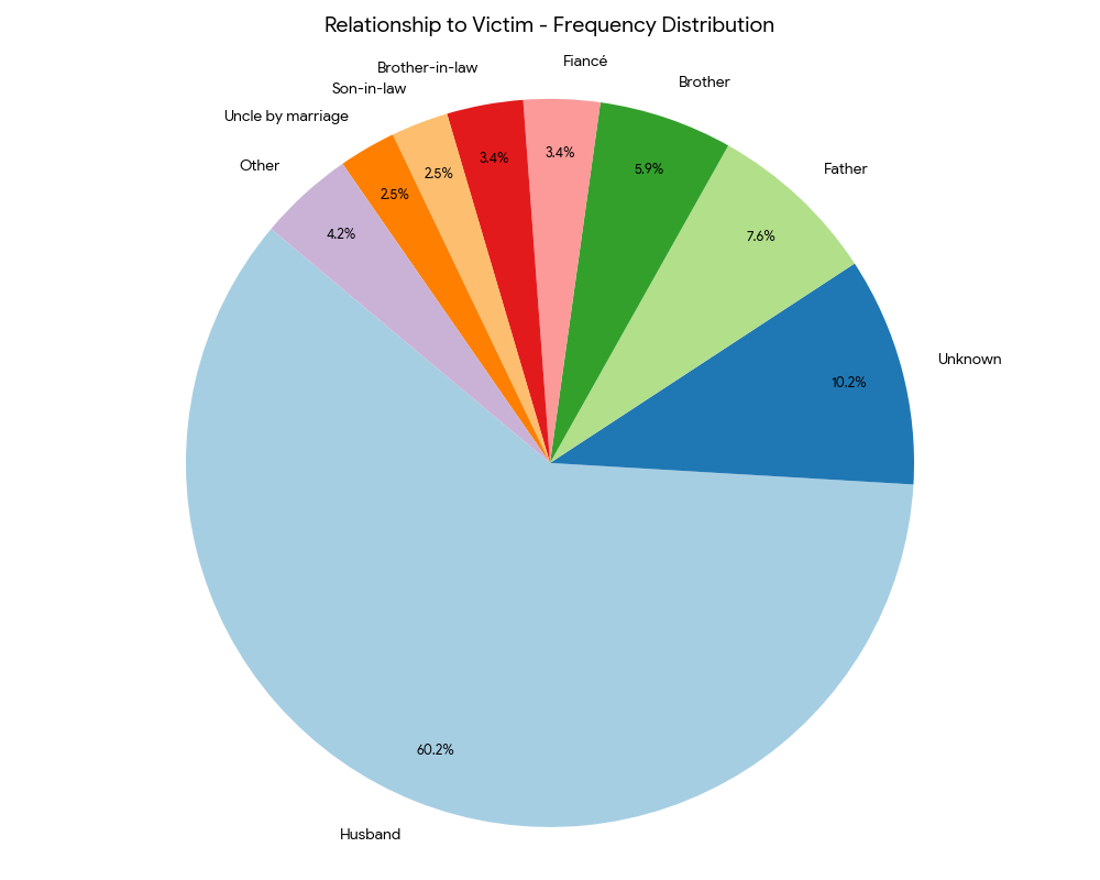 This chart clearly illustrates the distribution of the “Relationship to Victim,” highlighting that Husband is the most frequent category at 60.2%.