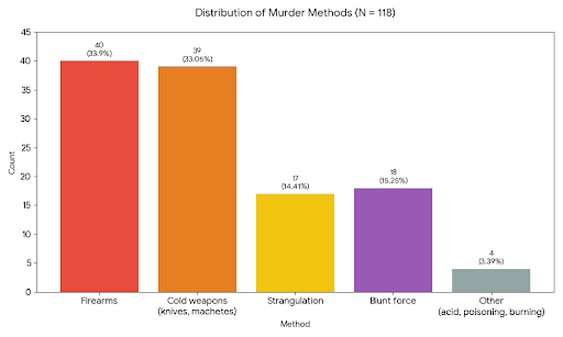 More than 67% of the killings were committed using firearms or bladed weapons (knives and similar instruments). The dominance of such lethal means indicates that a substantial proportion of these crimes were carried out with clear intent to kill and, in many cases, prior planning, rather than as spontaneous outcomes of accidental disputes.