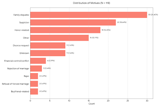 The analysis shows that Family disputes, Suspicion, and Honor-related motives are the most common factors, accounting for approximately 59% of the total cases.
