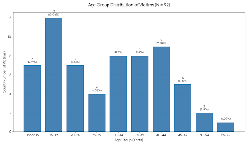 - Vulnerability of Minors: A significant number of victims (7 cases, 7.61%) are under the age of 15, highlighting the extreme vulnerability of children in these contexts.
