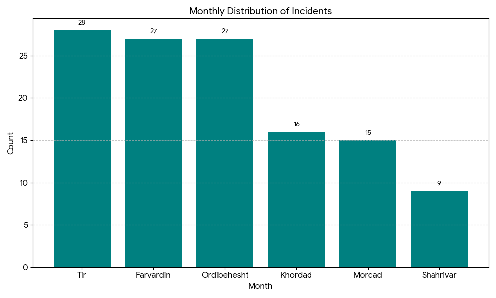 Interpretation: Over 70% of killings occurred between Farvardin and Tir (March–July 2025), suggesting predictable seasonal risk patterns, possibly linked to increased family interaction during Nowruz and early summer.