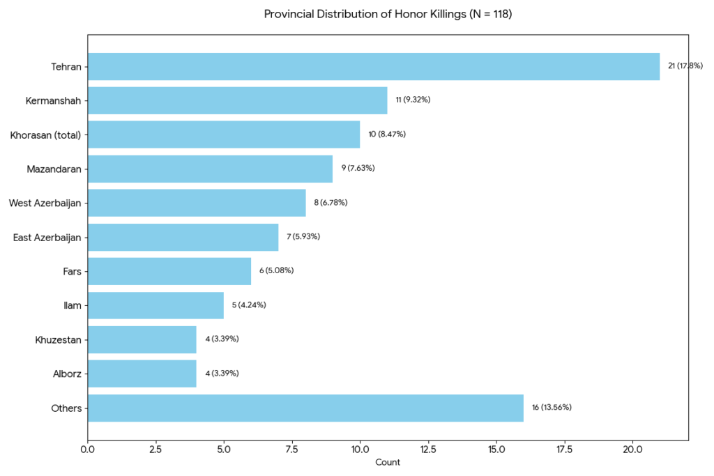 - Primary Hotspots: Tehran Province, with 21 recorded cases (17.80% of the total), is identified as the highest hotspot for honor killings during this period. This figure is nearly double the frequency of the second most frequent province. Kermanshah Province with 11 cases (9.32%) and the Khorasan region with 10 cases (8.47%) follow in the subsequent ranks. Collectively, these three primary hotspots account for more than one-third (approximately 35.6%) of all killings. However, it should be noted that the high statistics in Tehran are likely influenced by factors such as the province’s high population ratio and methodological issues (such as more active media coverage and news monitoring in metropolises compared to smaller towns where secrecy is more prevalent).