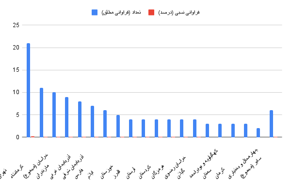 توزیع پراکنده و انتهای توزیع: بیش از نیمی از استانهای موجود در جدول، دارای فراوانی مطلق ۴ مورد یا کمتر هستند. استانهایی نظیر خوزستان، البرز، لرستان، کردستان و هرمزگان هر کدام با ۴ مورد (۳.۳۹٪)، در مقایسه با کانونهای اصلی، دارای آماری در سطح متوسط رو به پایین هستند. در انتهای توزیع، استانهایی نظیر چهارمحال و بختیاری تنها ۲ مورد (۱.۶۹٪) ثبت کردهاند و ۶ مورد باقیمانده (۵.۰۸٪) بین ۶ استان دیگر توزیع شدهاند که نشاندهنده پدیدهای با گستره ملی اما تمرکز محلی بالا است.