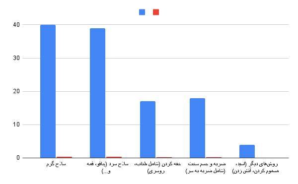 | ۵ | روشهای دیگر (اسید، مسموم کردن، آتش زدن) | ۴ | ۳.۳۹% |